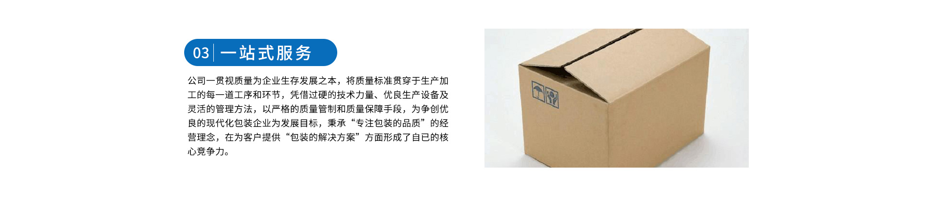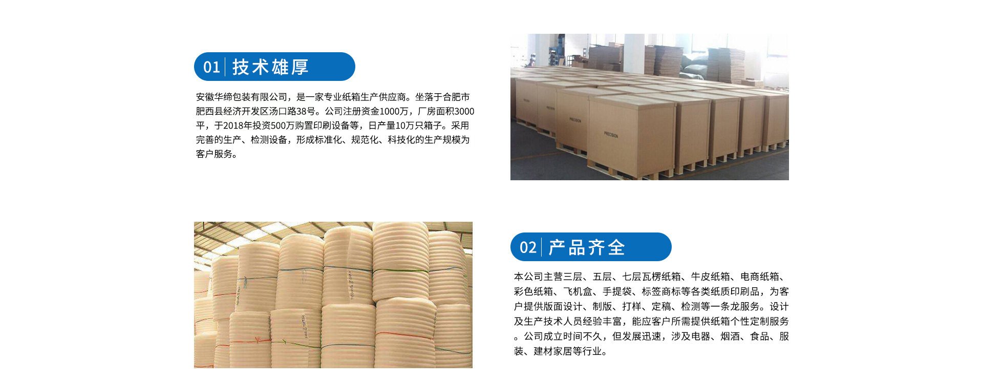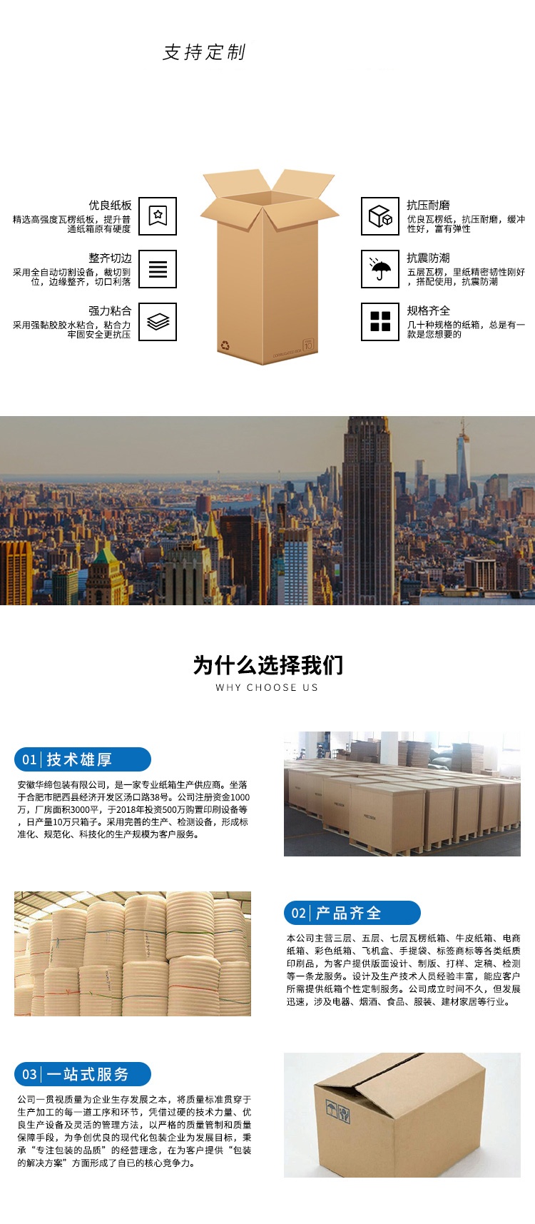 本公司主营瓦楞纸箱、重型纸箱、木制品等各类产品;三层、五层、七层瓦楞纸箱、牛皮纸箱、电商纸箱、彩色纸箱、飞机盒、手提袋、标签商标等各类纸质印刷品,EPE珍珠棉、气泡袋、EPS泡沫、EVA等发泡塑料类产品。为客户提供版面设计、制版、打样、定稿、检测等一条龙服务。设计及生产技术人员经验丰富,能应客户所需提供纸箱个性定制服务。公司进几年发展迅速,目前已与江淮汽车、长安汽车、合肥星源、华润医药、立方药业、汇通汽车零部件、丰创光罩、青松食品等达成合作,涉及汽车、医药、烟酒、食品、建材家居等行业。专业的技术,丰富的产品制作经验,高效的执行力,为客户提供高水准的包材供应服务。